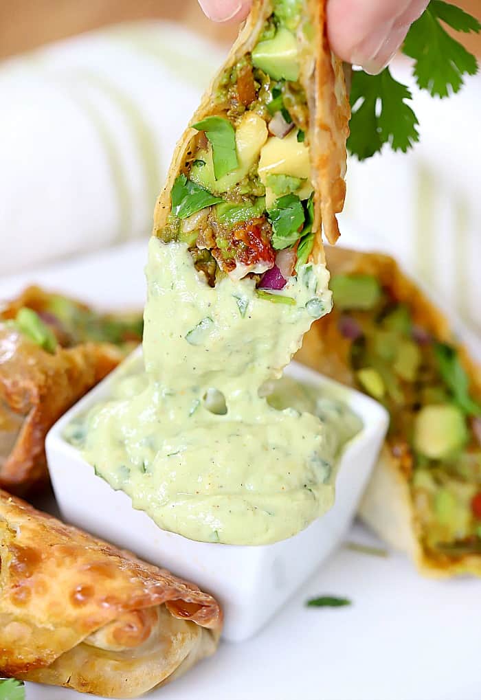 - While cooking, mix together avocado dip ingredients in a food processor. When egg rolls are finished, cut each in half and serve with avocado dipping sauce for a delicious appetizer or snack! Enjoy!