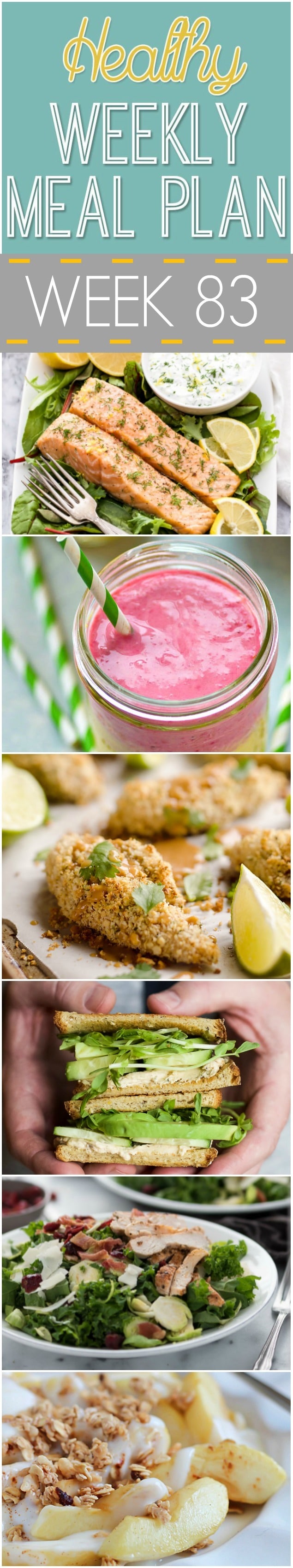 Healthy Weekly Meal Plan #83 has the yummiest of healthy dinner recipes included! There’s also a healthy breakfast, side dish, lunch and dessert recipe included, too! You will love this deliciously healthy menu plan!