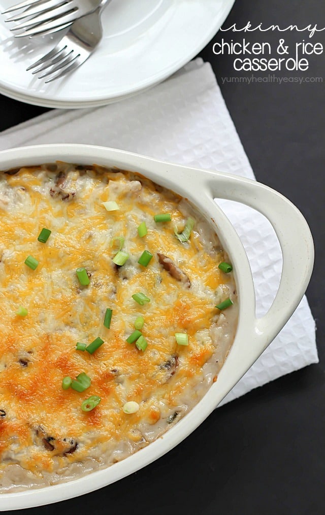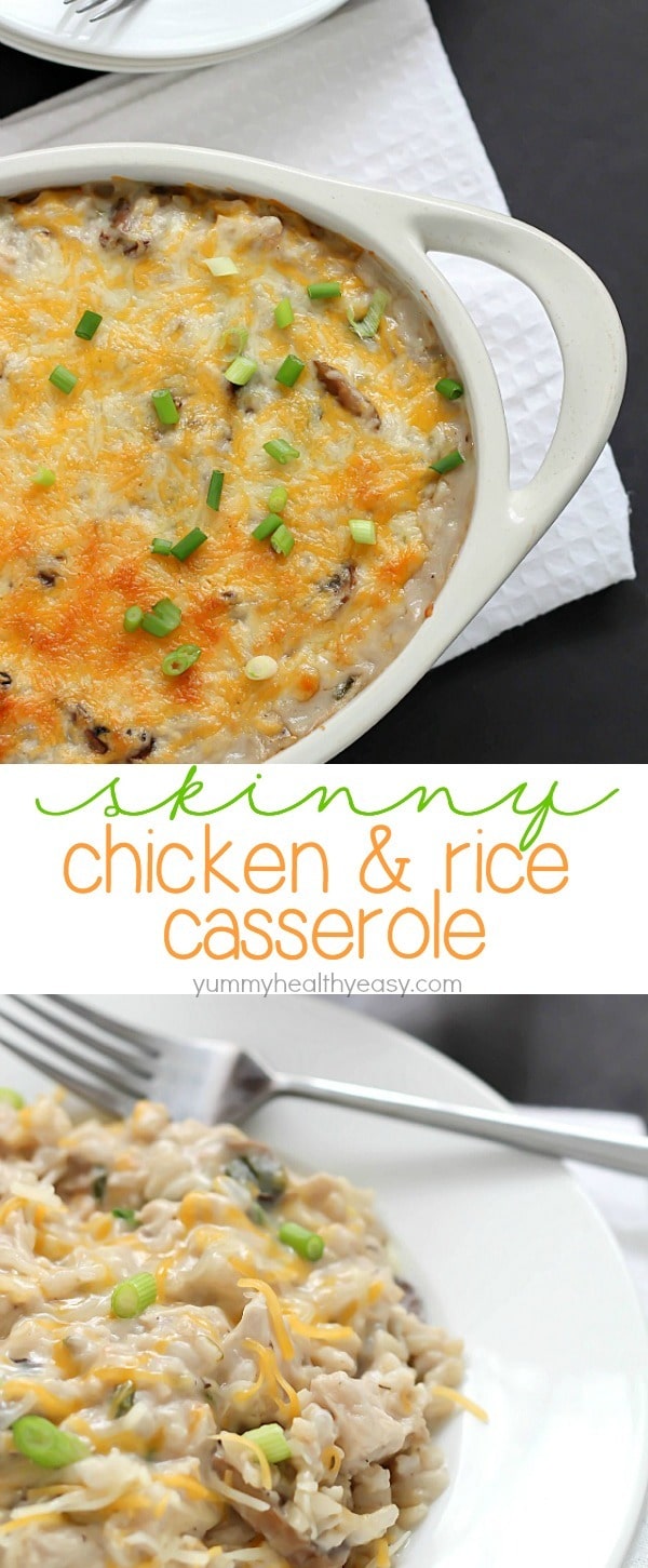 Easy Skinny Chicken and Rice Casserole using NO cream soups and made in about 30 minutes! Put this on your dinner menu – you will love this easy meal!