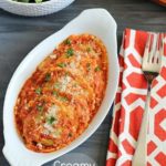 Spinach & cheese ravioli smothered in a delicious marinara sauce with a little creamy twist and then baked.