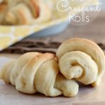 When ready to roll, divide dough in half. Roll into a large circle, spread with softened butter and cut into pie shaped triangles. Roll each triangle up into a crescent by starting from the outside of the triangle and rolling in toward the point. Repeat with other half of dough.