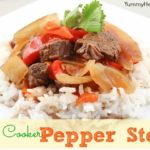 Mix bouillon cube with hot water until dissolved, then mix in cornstarch until dissolved. Pour into the slow cooker with meat. Stir in sliced onion and peppers, stewed tomatoes, soy sauce, sugar, and salt.